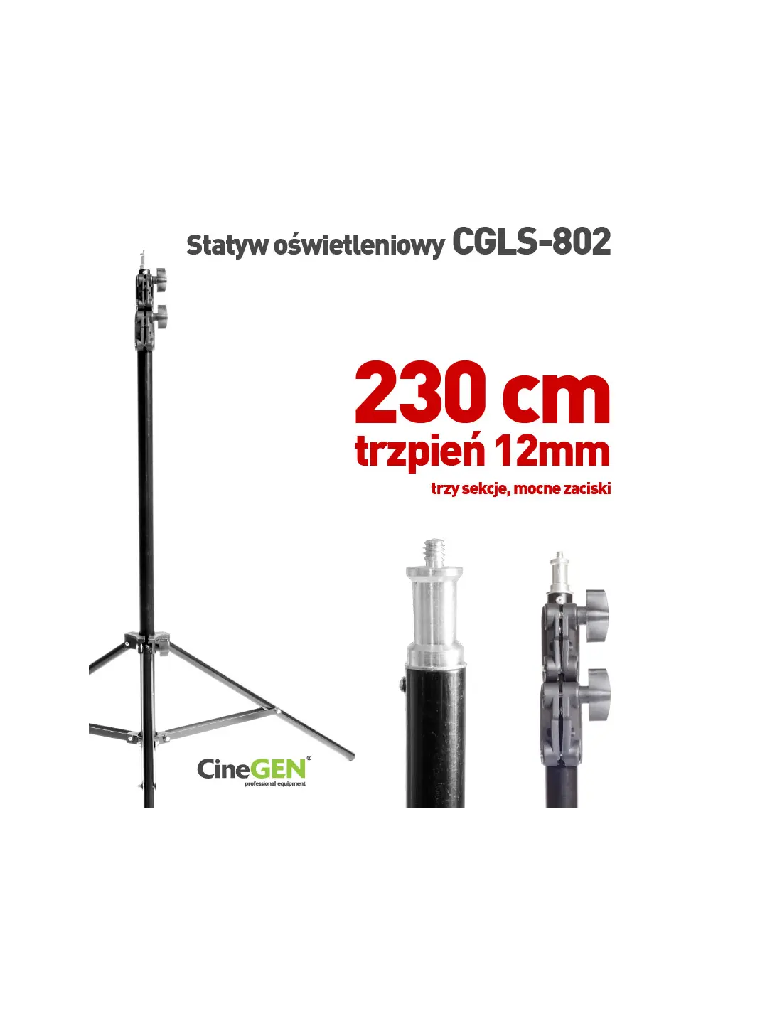 A lightweight, versatile lighting stand, perfect for studio and outdoor use, offering a maximum height of 230cm and featuring a 16mm studio head.