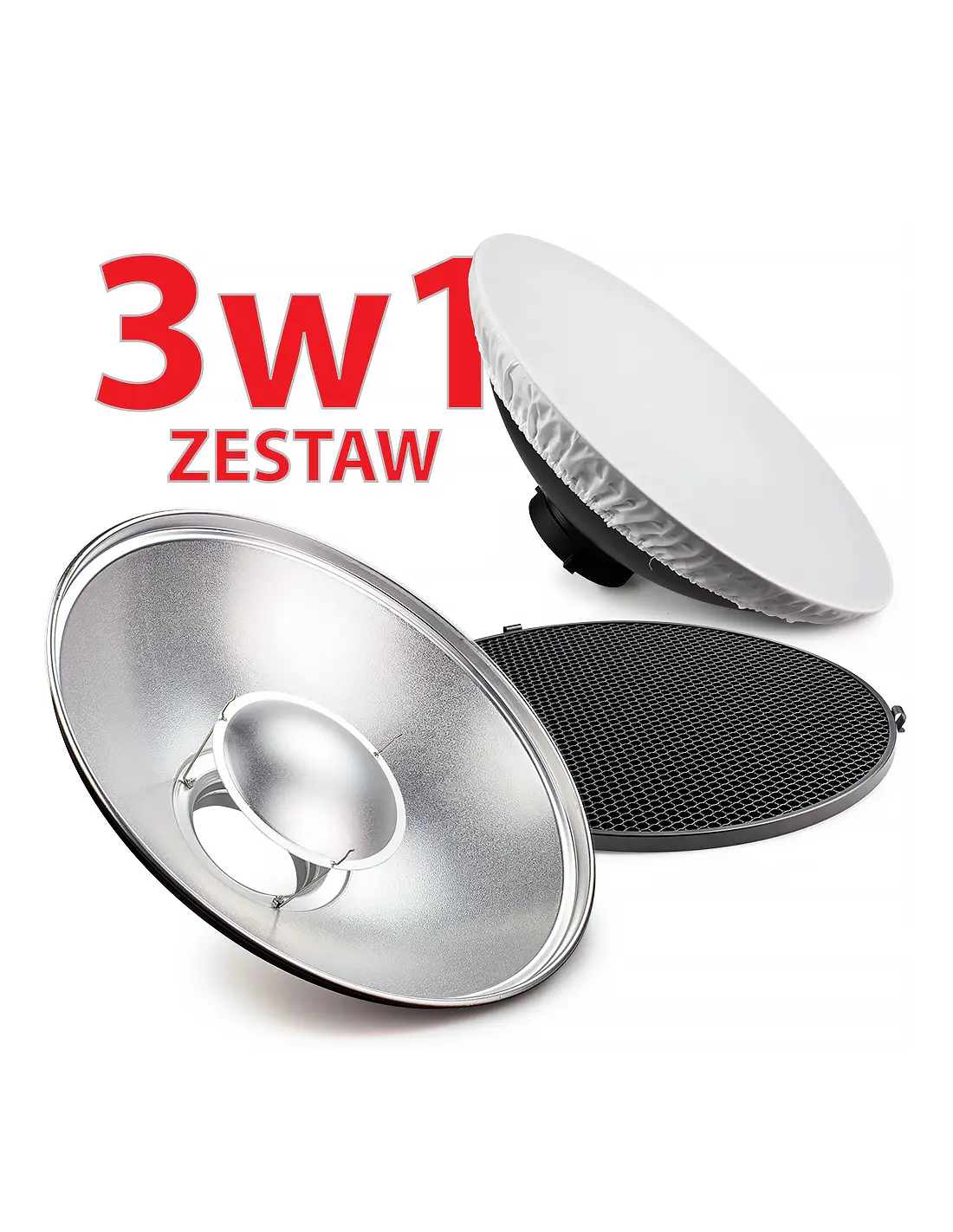 Profesjonalny Beauty Dish o średnicy 41cm z Plastrem Miodu i Dyfuzorem, zapewnia wyjątkowe, miękkie oświetlenie. Idealny do fotografii modowej, portretowej i produktowej.