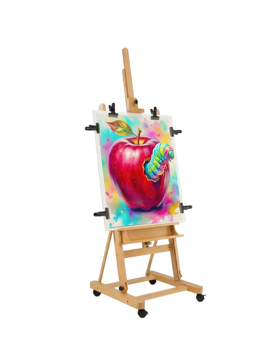 Po zakończonej pracy możesz bez wysiłku przestawić sztalugę w dowolne miejsce - nawet bez zdejmowania blejtramu z rozpoczętym dziełem. Nie musisz jej podnosić ani przesuwać po podłodze. Stabilna podstawa została wyposażona w cztery niewielkie kółka jezdne, które umożliwiają płynne i ciche przemieszczanie całej konstrukcji. Gdy ustawisz sztalugę w wybranym miejscu, wystarczy jeden ruch stopy, aby zablokować każde kółko za pomocą wygodnych hamulców naciskowych. To komfortowe rozwiązanie pozwala łatwo reorganizować przestrzeń pracy i zapewnia pełną stabilność podczas tworzenia.