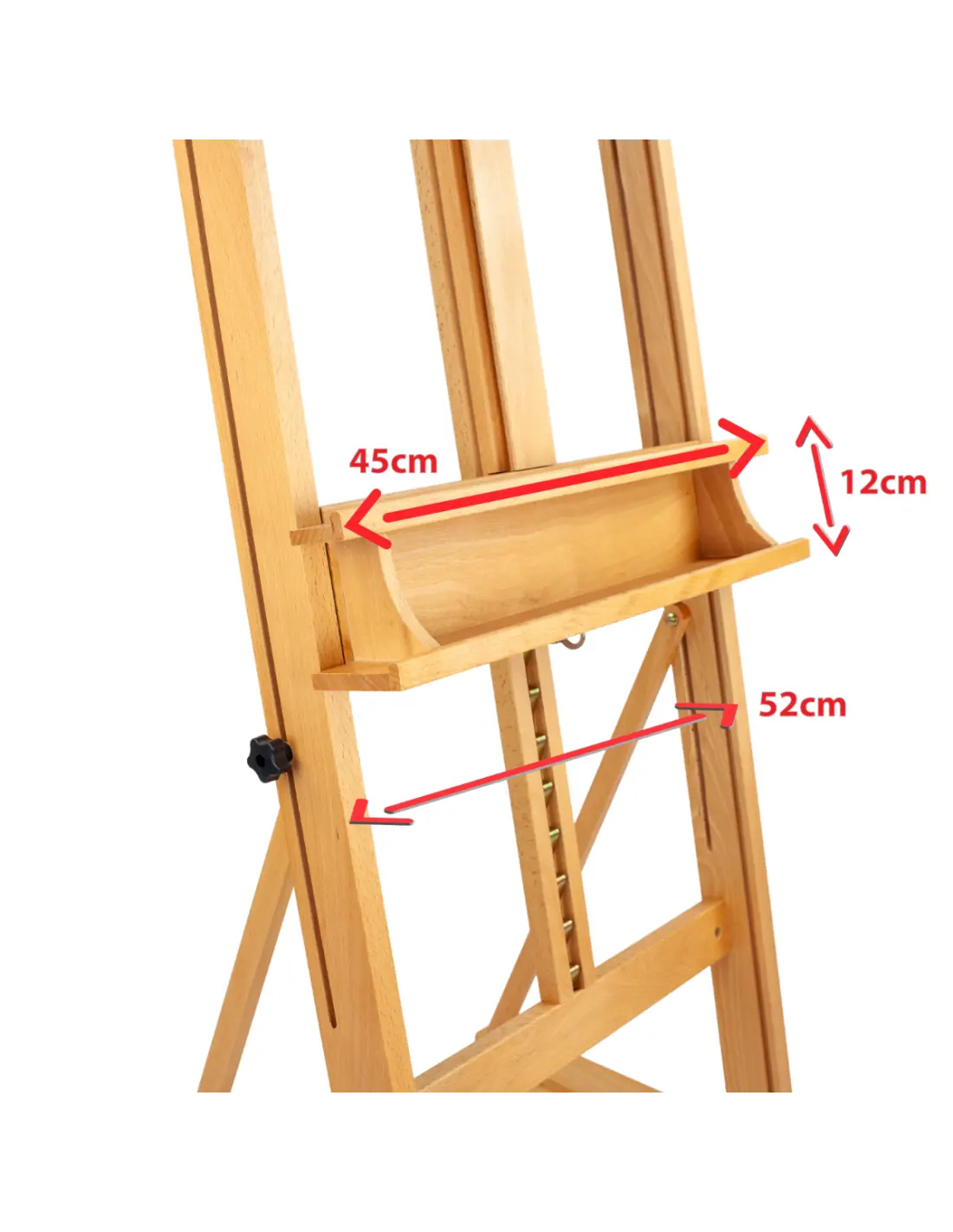Główną zaletą sztalugi jest jej uniwersalny i solidny system regulacji. Wysokość podobrazia lub ramy ustawia się za pomocą systemu zapadek na centralnej listwie, zabezpieczanych metalowym zamkiem. Kąt pochylenia całej konstrukcji można swobodnie regulować i pewnie blokować za pomocą motylków. Dzięki temu możliwe jest optymalne i niezwykle stabilne ustawienie pracy o maksymalnej wysokości do 230 cm.