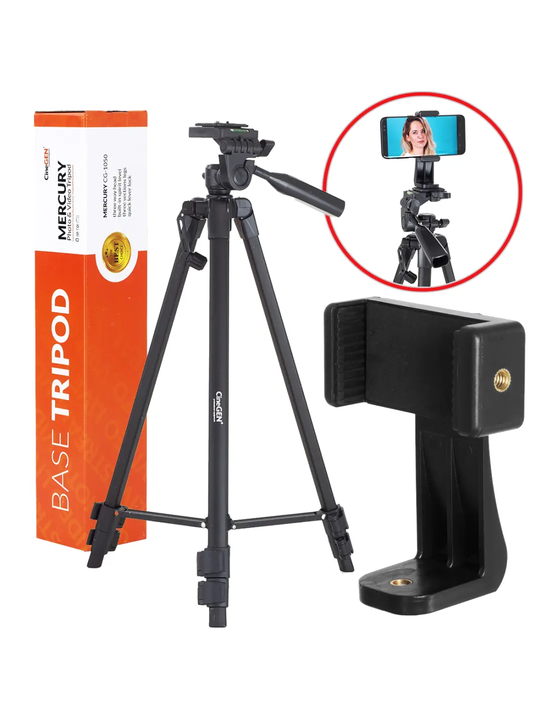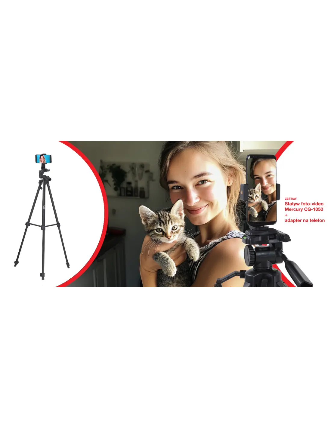 Kompaktowy statyw Mercury™ CG-1050 z adapterem do smartfona, idealny dla początkujących fotografów i filmowców. Lekki, stabilny i łatwy w obsłudze, doskonały do domowych studiów i transmisji na żywo. Zasięg 360° oraz pochylenie +120° - 120°.