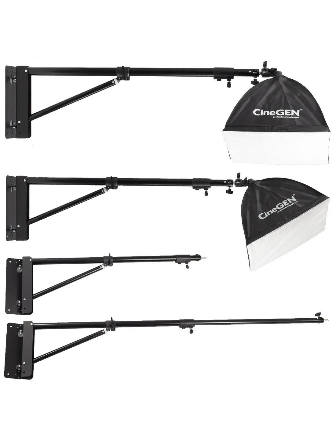 Wall&Rod™ marki CineGEN® to wyjątkowy uchwyt ścienny pozwalający na montaż lamp fotograficznych i studyjnych bez potrzeby używania statywów podłogowych, co jest doskonałym rozwiązaniem w miejscach o ograniczonej przestrzeni. Dzięki wytrzymałej teleskopowej belce montowanej na kotwy do ścian i sufitów, Wall&Rod™ gwarantuje nie tylko niezrównaną stabilność, ale także możliwość instalacji dużych lamp z dyfuzorami, lamp Fresnela czy paneli LED. Innowacyjny projekt pozwala na regulację kąta w płaszczyźnie poziomej, a także składanie uchwytu wzdłuż ściany, co oszczędza miejsce w studi. Dodatkowo w trakcie pracy istnieje możliwość zmiany kąta (w płaszczyźnie poziomej względem ściany). Otwory montażowe do trzpienia mocującego wieńczące ramię uchwytu umożliwiają montaż trzpienia wzdłużnie i poprzecznie do osi ramienia.