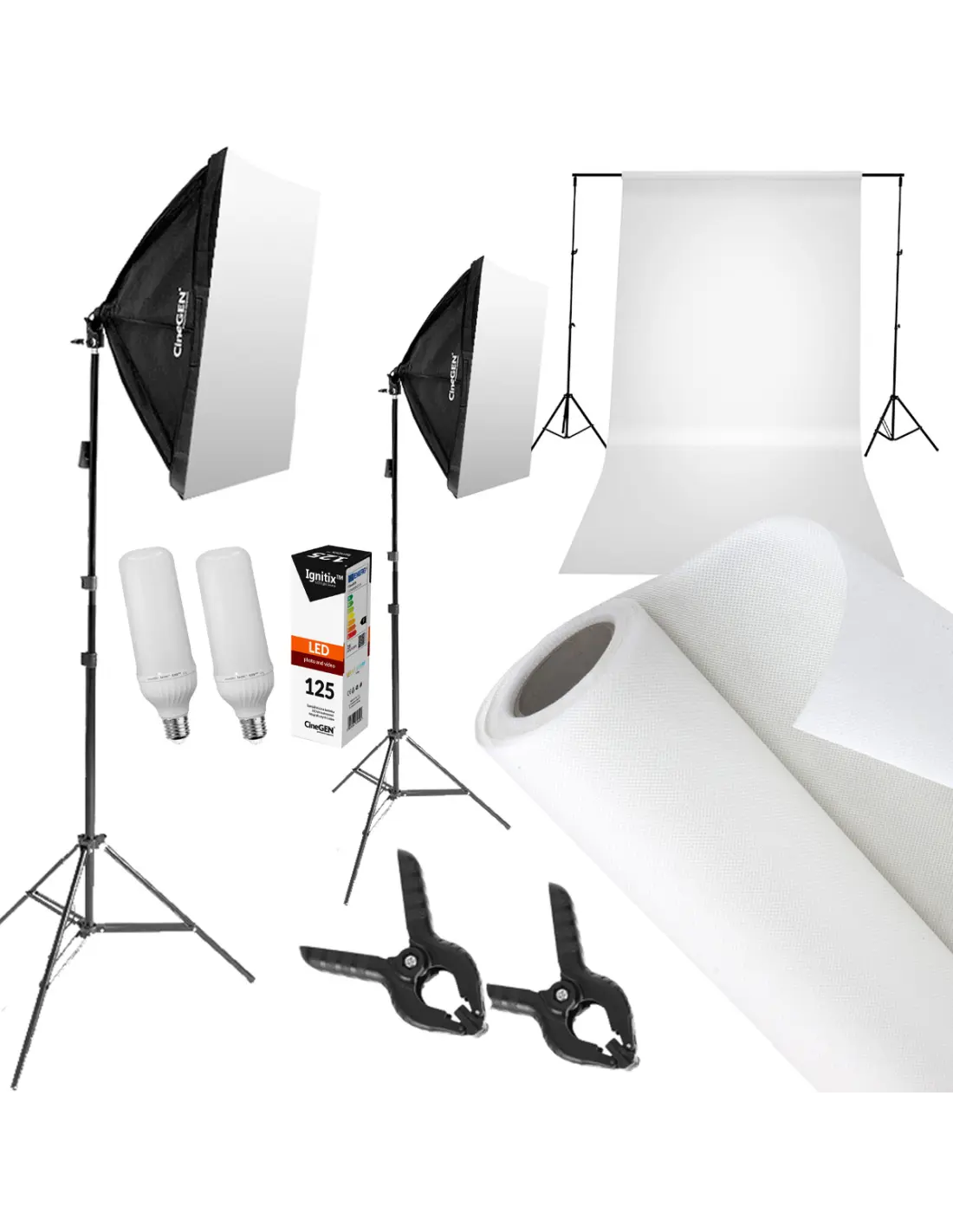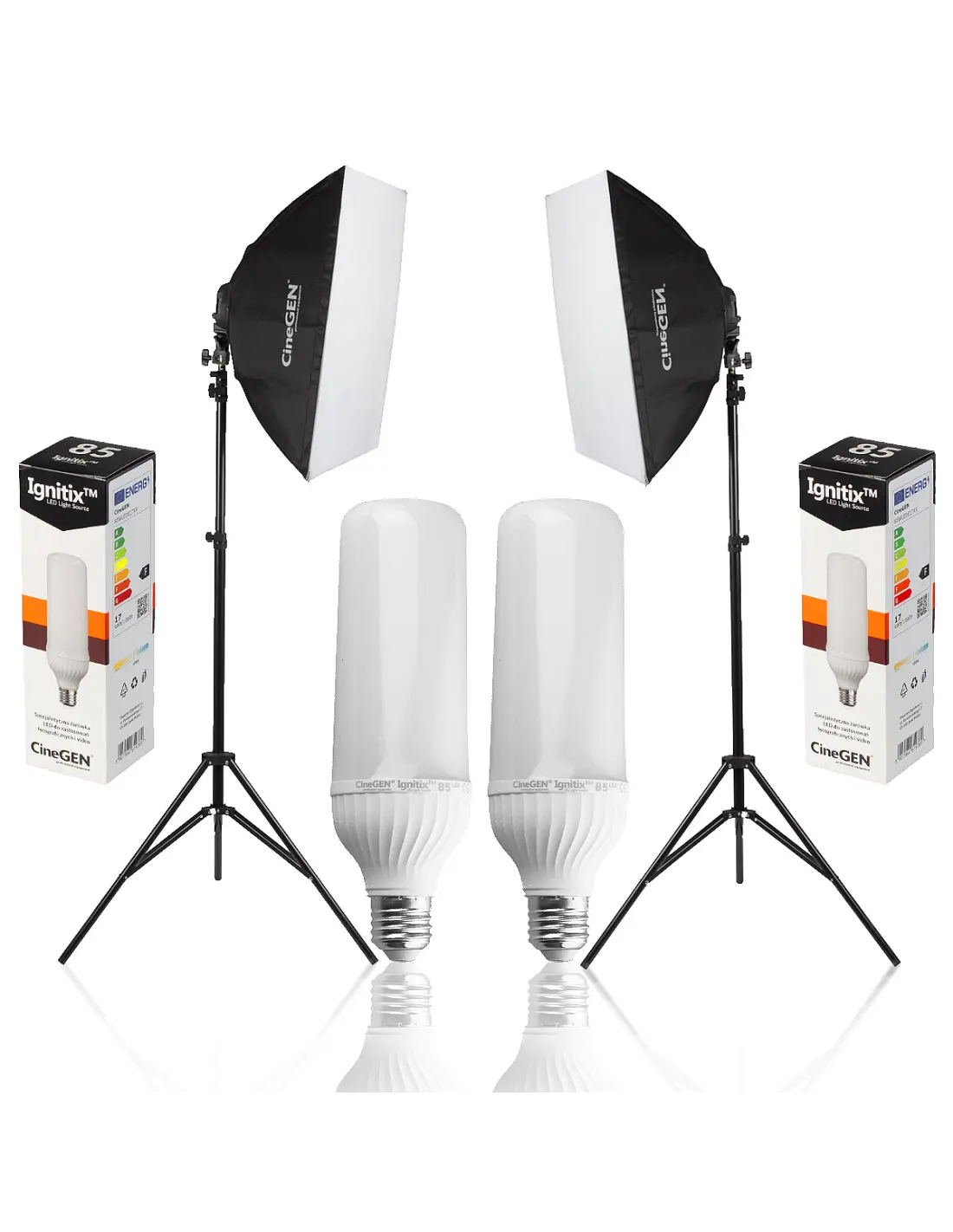 Użyte w zestawie oświetlenie to klasyczne studyjne oświetlenie ciągłe - jednożarówkowe lampy typu softbox na statywach oświetleniowych. Softboxy wyposażone są w żarówki LED serii Ignitix™ o standaryzowanych parametrach (temperatura barwowa 5500K oraz współczynnik odwzorowania barw CRI >90). Softboxy to podstawowy element studia fotograficznego. Łagodzą przejścia tonalne między światłem i cieniem. Światło jest równomiernie rozprowadzane we wnętrzu softboxu i zachowuje identyczną moc na całej powierzchni dyfuzora. Na zewnątrz softbox jest matowo czarny, dzięki czemu nie odbija światła innych lamp. Rozkładanie i składanie jest wyjątkowo proste, a złożony softbox zajmuje niewiele miejsca. Wysoka jakość materiałów, z których wykonany jest softbox, gwarantuje bezproblemową eksploatację przez lata.