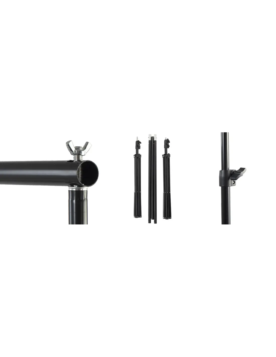 Zestaw składa się z dwóch statywów studyjnych oraz przymocowanej do nich składanej belki. Stelaż umożliwia zawieszenie różnych teł fotograficznych (kartonowych, winylowych czy tkaninowych) do 5 kg oraz o maksymalnej szerokości 180 cm. Tła mogą być zawieszone na wysokość: od 83 cm do nawet 200 cm. Belka została przymocowana do statywów za pomocą nakrętek motylkowych, co zapobiega jej podrywaniu podczas podnoszenia tła do góry. Rozwijanie tła z rolki blokowane jest poprzez wpięcie dwóch uchwytów (żabek) dołączonych do zestawu. Dodatkowo w zestawie jest torba transportowa pozwalająca złożyć cały stelaż w jedne kompaktowy pakiet.
